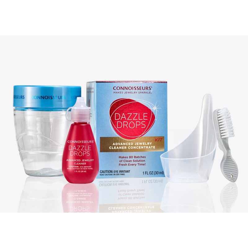 Non-Toxic Dazzle Drops Advanced Jewelry Cleaner makes fresh cleaning solution every time, so there’s no more cleaning in dirty solution. Just Squeeze, Dip and Dazzle! Includes enough solution for more than 80 (10-drop) cleanings, an easy-to-use dipping scoop, and a grip-easy cleansing brush designed to clean all jewelry surfaces. The elegant cleansing container conveniently stores brush, scoop, and drops…and now holds more jewelry. Perfect for gold, platinum, diamonds, delicate jewelry, precious and semi-precious stones.