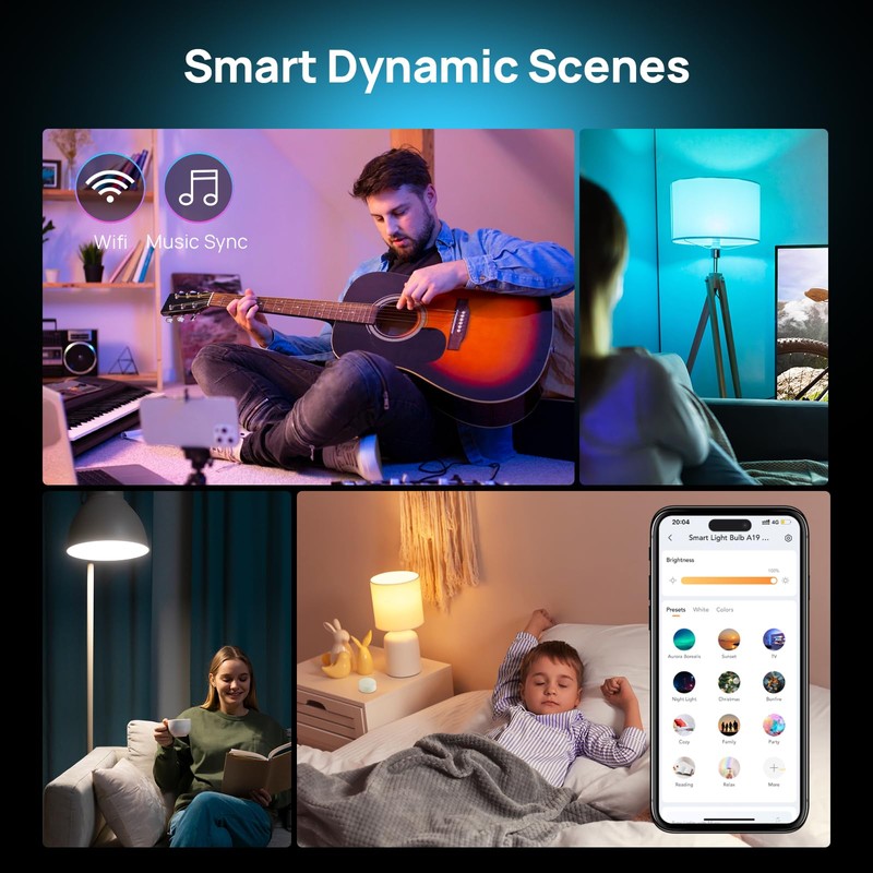 - [Group Control & Music Sync] You can create a group to simultaneously control multiple smart bulbs from anywhere with a stable 2.4GHz Wi-Fi connection. Control these smart LED bulbs with your family for added fun. Our smart light bulbs change color and brightness when your phone's microphone detects sound. Note: Make sure the microphone is not occupied. Download AiDot App and enable microphone permissions.