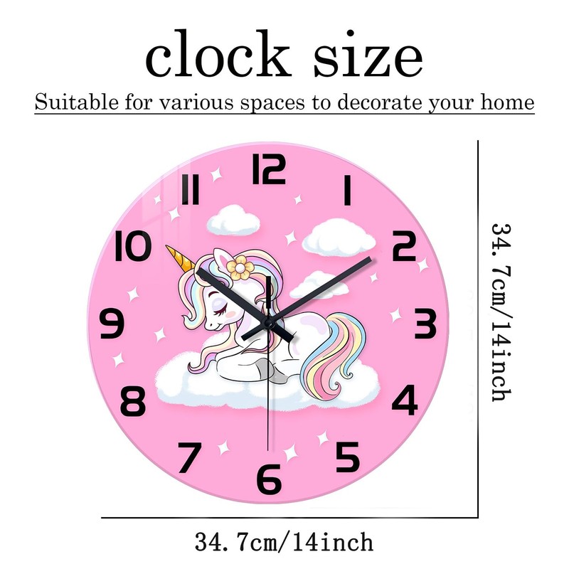 Constantplanet Unicorn Clock for Girls Bedroom - Pink Wall Clock Battery Operated 14 Inch - Glass Analog Wall Clock Non Ticking