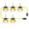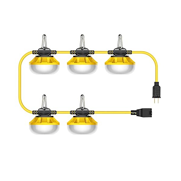 - EASY TO HOOK UP: LED Work Lights come with 5psc Carabiner Hooks easy to set up and save labor cost, each AC line is 50 feet long, 5 high-intensity LED caps, each projecting 1000 lumens, capable of linking up to 16 light sets(total 800FT) with waterproof plug. Become the VIP of our waterproof, rainproof, and collision-proof industrial lamps and enjoy more benefits.