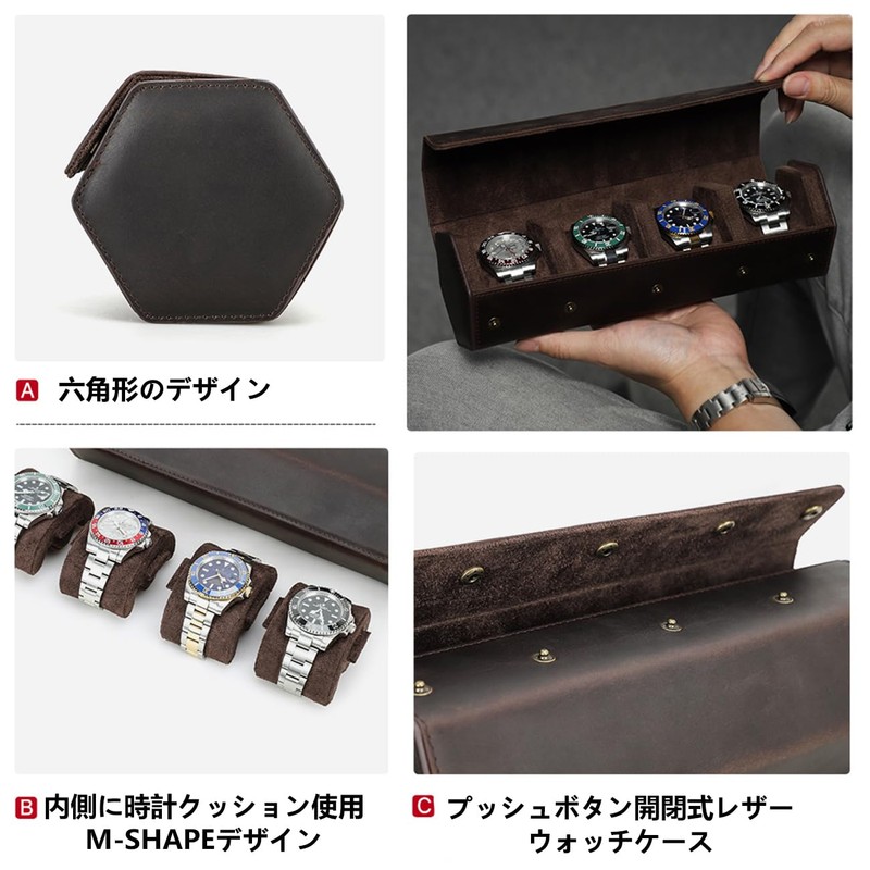 Contact's family Hexagon Genuine Leather Watch Roll Watch Storage Box for 4 Watch Storage Leather Waterproof Shockproof Watch Case Storage Carrying Travel Portable