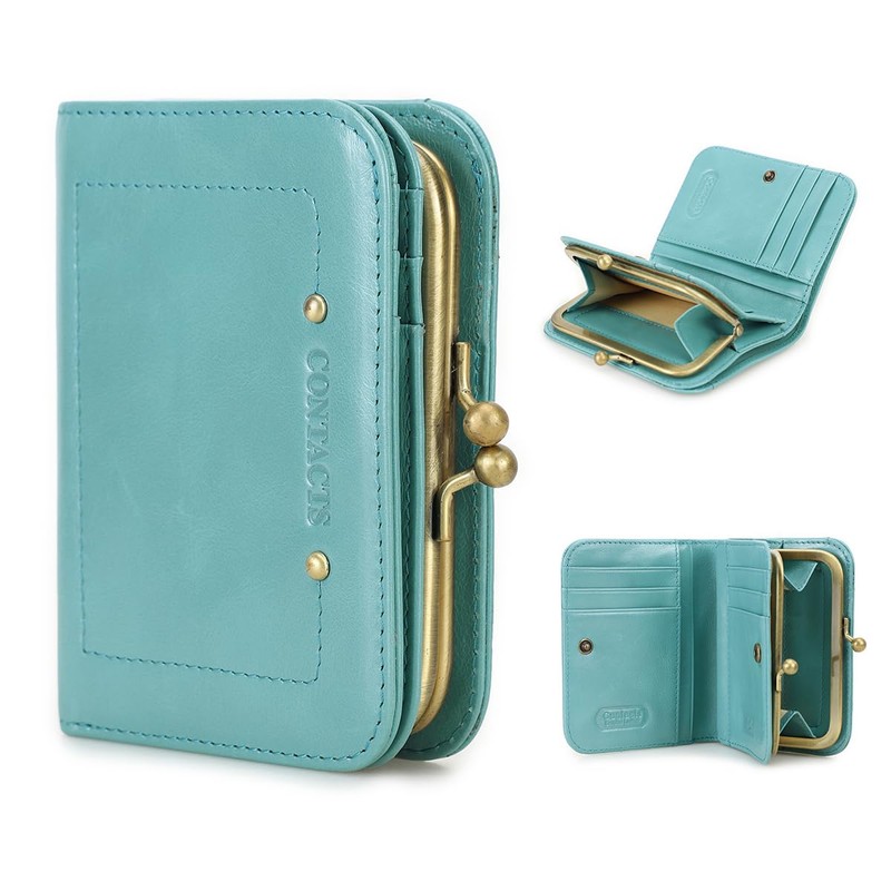 [Contact's serie] Full Grain Leather Bifold Wallet RFID Blocking 9 Card Slots Coin Pocket Coin Purse for Women, Sky Blue