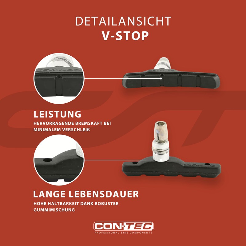 - Optimal deceleration: the CONTEC V-Stop brake shoe offers excellent braking performance thanks to its medium-hard rubber compound and at the same time reduces wear - for reliable deceleration