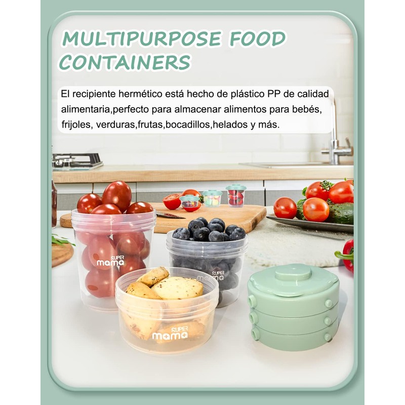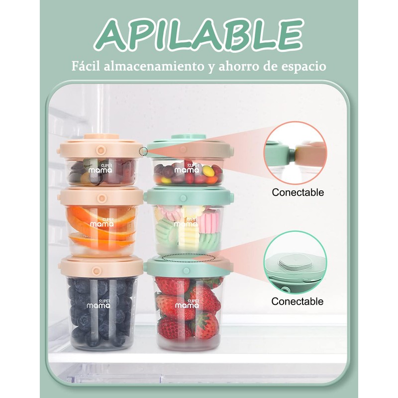 - 💚【Materiales de calidad alimentaria】 - Cada paquete incluye 2 recipientes de 60 ml, 2 de 120 ml y 2 de 200 ml para alimentos, fabricados con material PP de calidad alimentaria. Son duraderos, a prueba de roturas y no contienen sustancias dañinas. Adecuados para almacenar snacks, purés de vitaminas, verduras, frutas, yogur, cereales, etc. Se pueden lavar y reutilizar.
