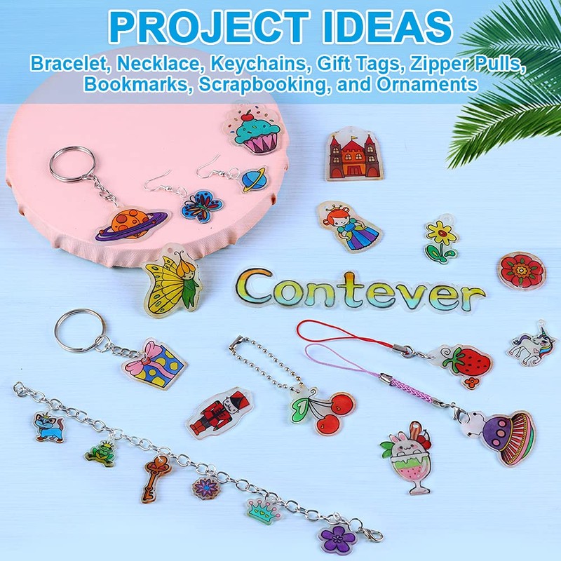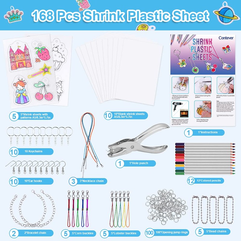 Contever Pack of 168 Shrink Film Set, A5 Shrink Film Set, Key Ring Including 5 Transparent Shrink Paper, 15 Shrink Films for Crafts with Pattern, Clasp, Pencils, Hole Punch, for Children