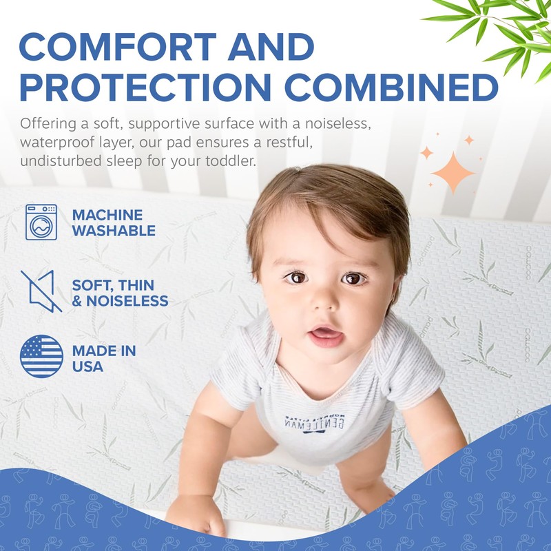 Waterproof ProtectionOur protector is equipped with waterproof technology to safeguard your child's mattress against spills, leaks, and accidents. Enjoy peace of mind knowing that your little one's sleep space is protected from unexpected messes, while still maintaining a comfortable and cozy feel.