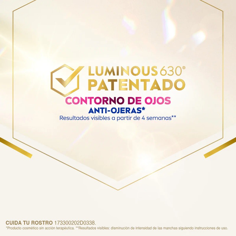 - El ingrediente patentado Luminous630® ha sido específicamente adaptado para el contorno de ojos. Actúa en el origen de las ojeras, regulando la producción de melanina para disminuir su intensidad y tamaño en las ojeras pigmentadas, vasculares y las causadas por el cansancio.