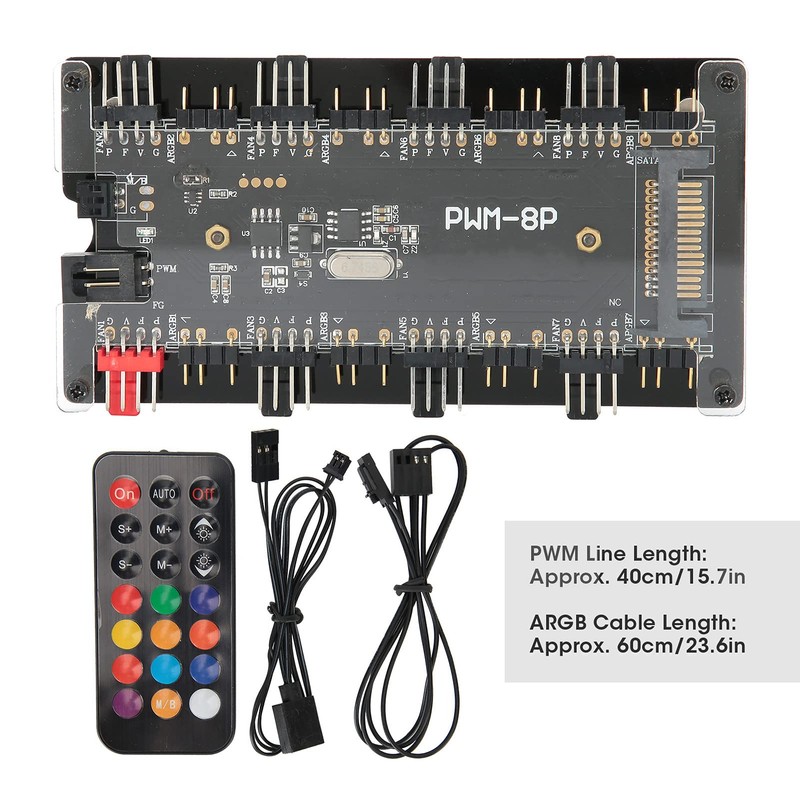 5. 8 puertos ARGB (5 V 3 pines), 8 puertos de ventilador (4 pines) función PWM, iluminación de 1x3 pines, sincronización de placa base ARGB de 5 V, 1 puerto de control de temperatura de placa base, para fuente de alimentación , y el botón de control remoto tiene 21 teclas.
