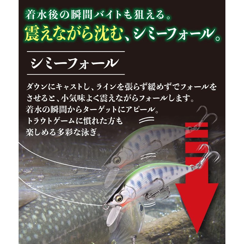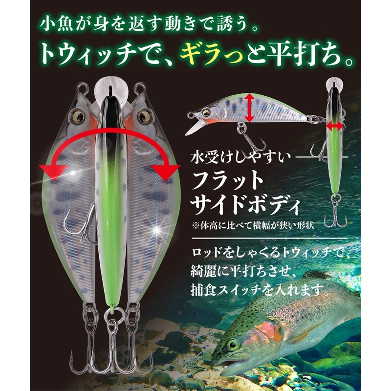 - 【明滅効果】大幅な体高の扁平ボディに加え、背中部分を薄くすることで、大きな平打ちが出やすい形状。/大きめな明滅効果で、ターゲットへアピールします。