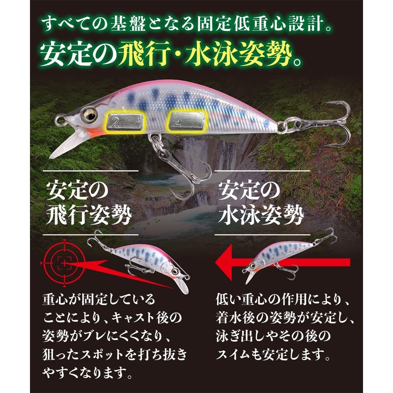 - 【キャスト性】固定低重心による安定姿勢。/飛行姿勢が安定しやすく、狙ったスポットを打ちやすくなり釣果の安定に。