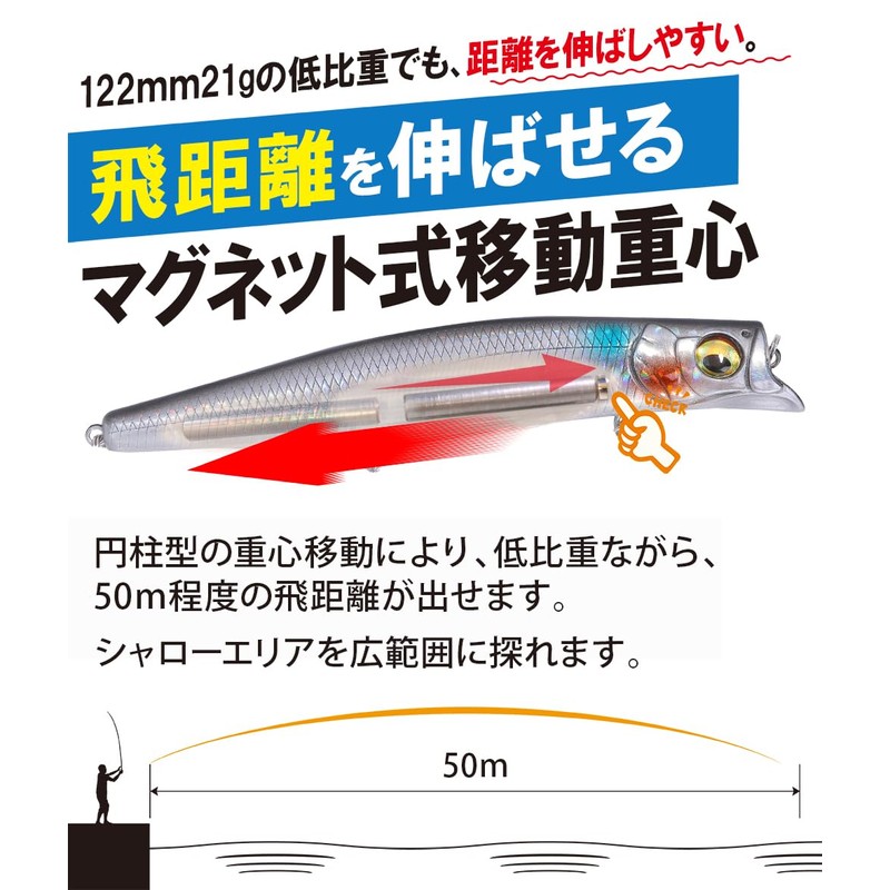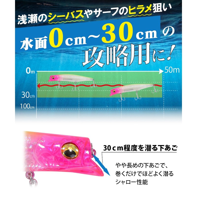 • For attacking water surfaces 0 - 30 cm (0 - 30 cm) : Mid dive in sea bass, entering shallow water for predatory / Also effective for surf flounties aiming at minnowfish above the head
