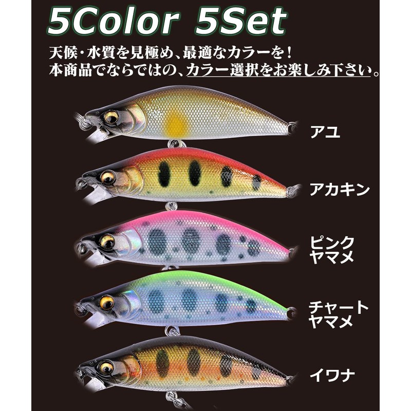 - Specifications: 2.0 inches (50 mm), 0.2 oz (5.3 g), Heavy Sinking, Fixed Low Center of Gravity, Equipped with Treble Hooks, Wobbling Type, 5 Colors