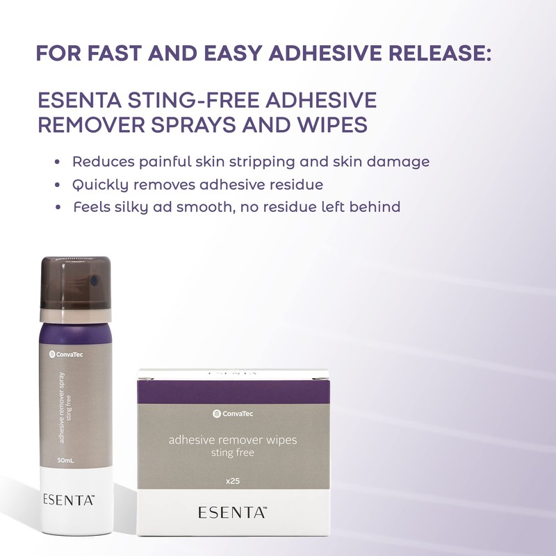 - EASY TO USE 1. Spray around the edge of the adhesive and wait a few seconds 2. Gently peel adhesive away from the skin. 3. Once dried ESENTA Adhesive Remover will not affect adhesion of further dressings or appliances
