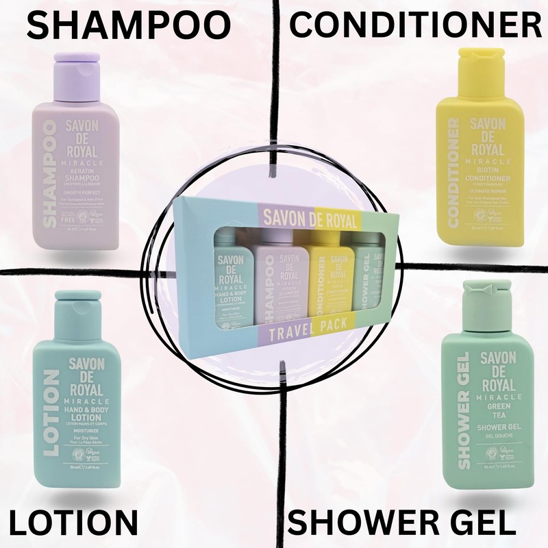 Travel Essentials Pack – Shampoo, Conditioner, Lotion & Shower Gel Stay fresh and revitalized wherever your adventures take you with our Travel Essentials Pack. Designed for convenience and effectiveness, this compact set includes a nourishing shampoo, hydrating conditioner, soothing lotion, and gentle shower gel — all in perfectly sized bottles to fit your carry-on or handbag. Each product is thoughtfully formulated to cleanse, hydrate, and refresh without weighing you down. Whether you’re on a quick business trip or a long vacation, our travel pack ensures your skin and hair get the care they deserve. Key Benefits: Lightweight, travel-friendly sizes for easy packing Gentle, effective cleansing and moisturizing formulas Suitable for all hair and skin types Refreshing scents that uplift and invigorate Free from harsh chemicals, perfect for sensitive skin Elevate your travel routine with our all-in-one care pack — your perfect companion for beauty on the go.