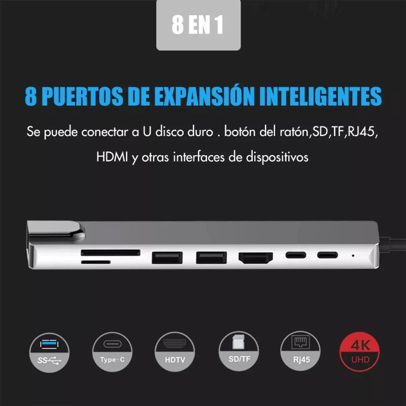 Descripción Limpia: Concentrador USB tipo C 8 en 1: el adaptador multipuerto USB C 8 en 1 cuenta con puerto de carga PD, puerto HDMI, ranura para tarjeta SD/TF, puerto Ethernet, 2 puertos USB, 1 USB/C.