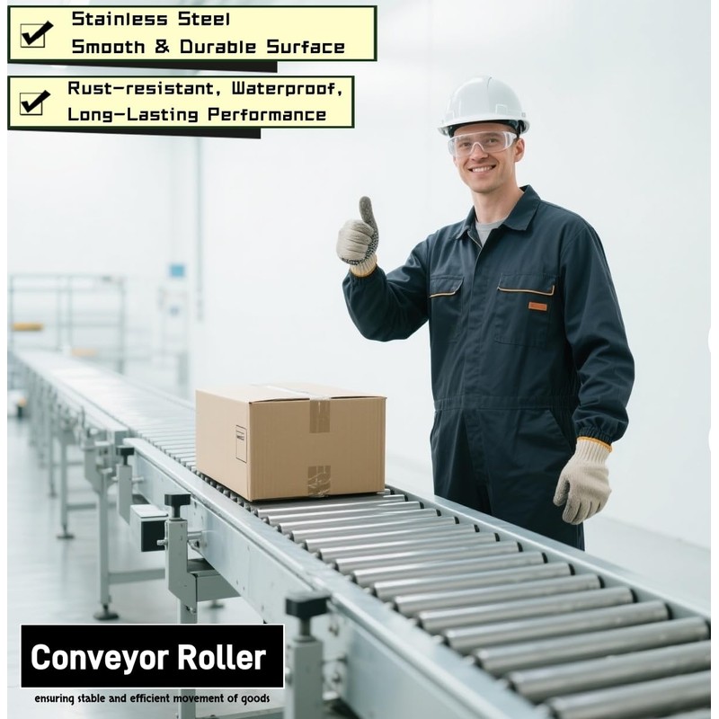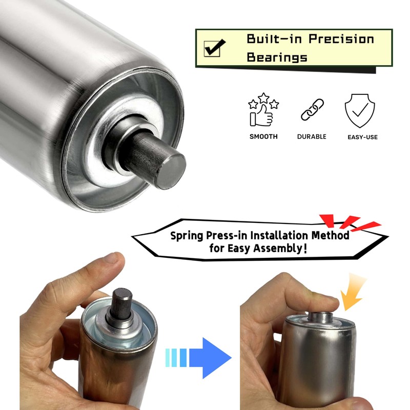 - The conveyor roller is made of premium stainless steel with galvanized end caps for superior rust- and water-resistance. It features a smooth, durable surface, built-in precision bearings, and a spring press-in installation method for easy assembly and long-lasting performance.