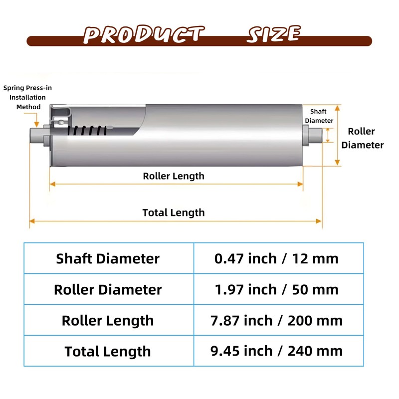 - Shaft Diameter: 0.47 inch (12 mm); Roller Diameter: 1.97 inch (50 mm); Roller Length: 7.87 inch (200 mm); Total Length: 9.45 inch (240 mm)