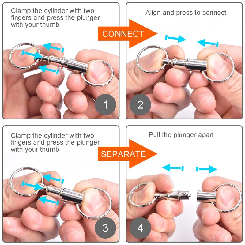 ★ Innovative design, spring-loaded ball bearing coupling mechanism prevents accidental release, you don't have to suffer from prying open the key ring, which can hurt and damage your nails, you also don't have to worry about it breaking or losing your keys.