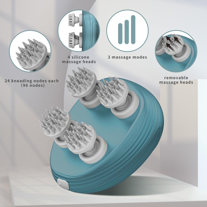 - INNOVATIVE DESIGN – With 3 massage modes (slow-normal-quick) to provide you with a soothing massage, this electric scalp massager for headaches helps promote blood flow to the scalp and encourages healthy hair growth. Featuring 4 silicone massage heads that have 24 nodes each (96 nodes) that replicate the sensation of human hands, this scalp massager electric comb is extremely easy to use and comes with a charging cable plus instruction sheet.