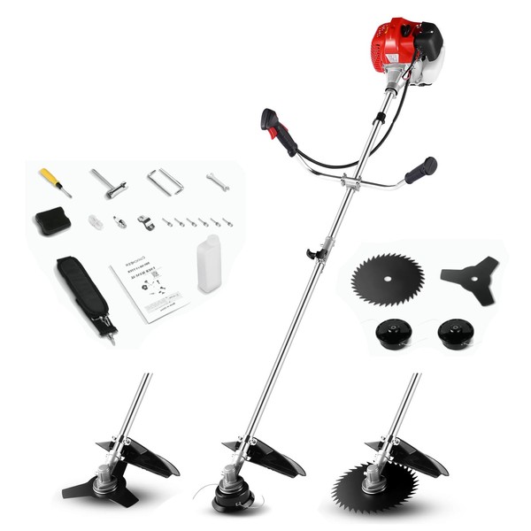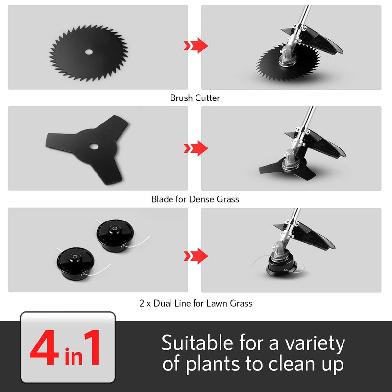 - 【4 Trimming Heads】This weed eater gas powered is equipped with 4 interchangeable cutting heads: two 9.8-inch dual-line trimmer heads, one 18.5-inch 3T blade, and one 18.5-inch 40T circular blade. This 4-in-1 gas trimmer is designed for tackling various tasks, from trimming grass to cutting thick vegetation. Quickly swap trimmer heads to handle any type of weeds with ease.
