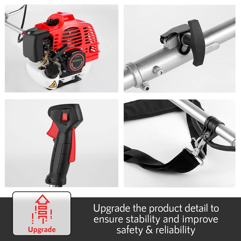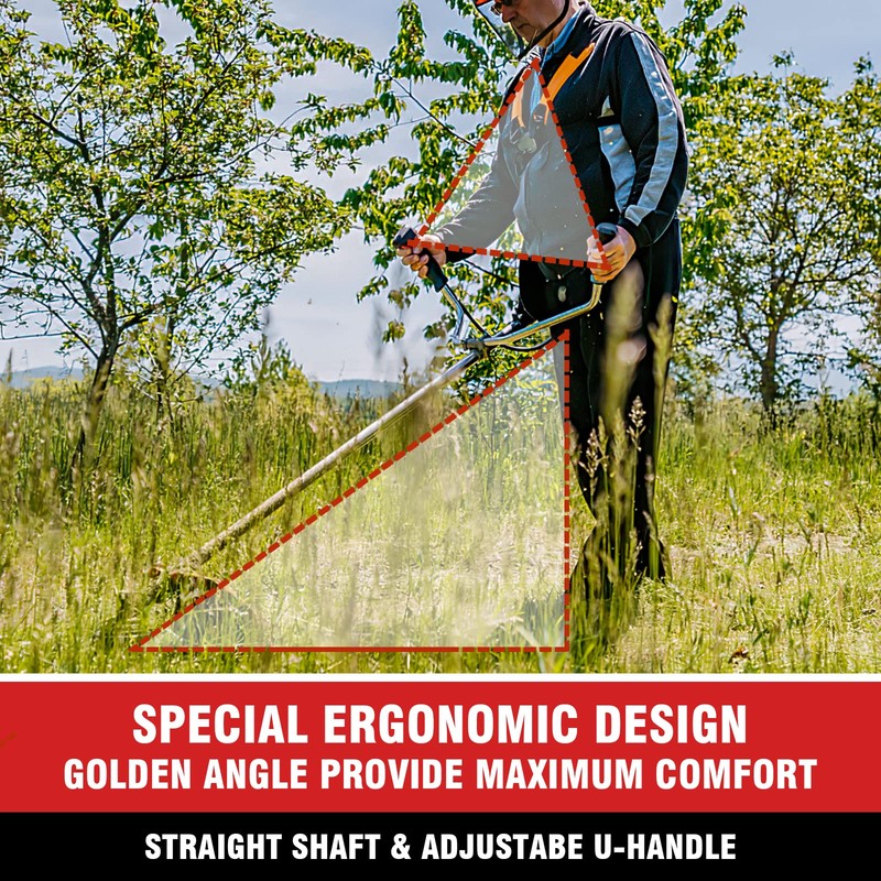 - 【Ergonomic & Comfortable Design】The gas powered brush cutter is designed with an adjustable U-shaped handle for better control and reduced strain. The non-slip grip and adjustable shoulder strap help distribute weight evenly, reducing fatigue. The straight shaft design makes it easy to trim under bushes and hard-to-reach areas without bending over.