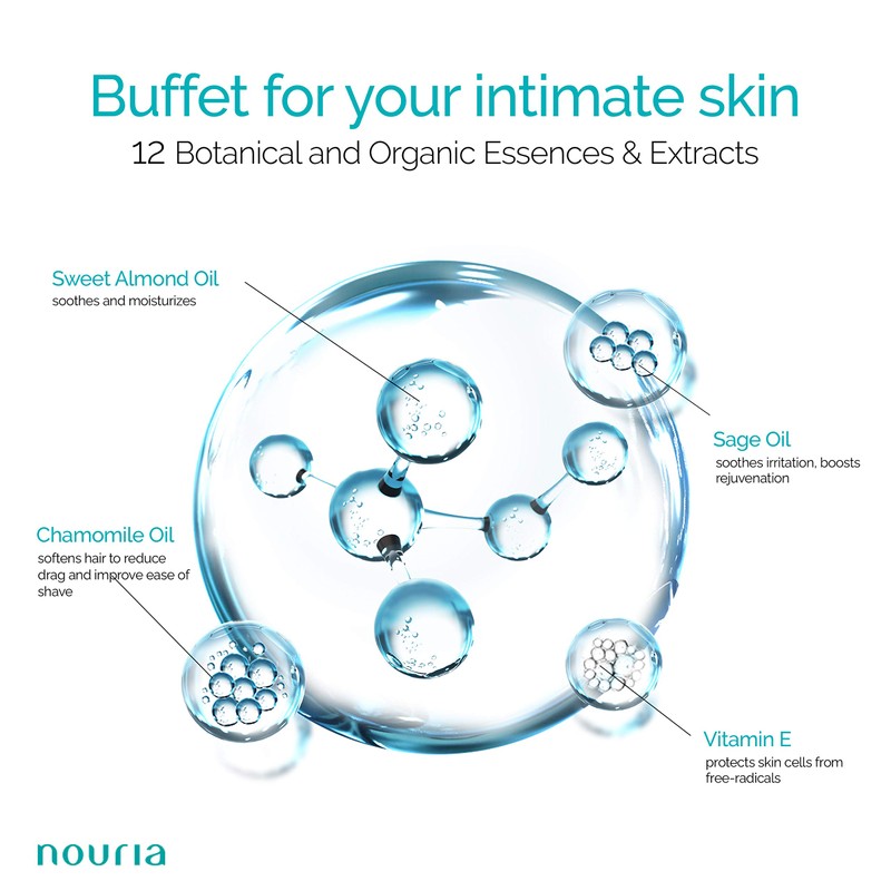 • NOURIA Pre-Shave Elixir Oil contains HydroLock, meticulously formulated with concerted mix of 12 botanical and organic essence and extracts that are rich in deep-hydrating and long-lasting moisturization properties. It further fortifies your intimate skin for maximum moisture retention and prevents moisture loss. Nourishing areas normally forgotten or unnoticed. It reduces ingrown hair, razor burn, razor bump, itchiness and other irritations commonly associated with shaving.