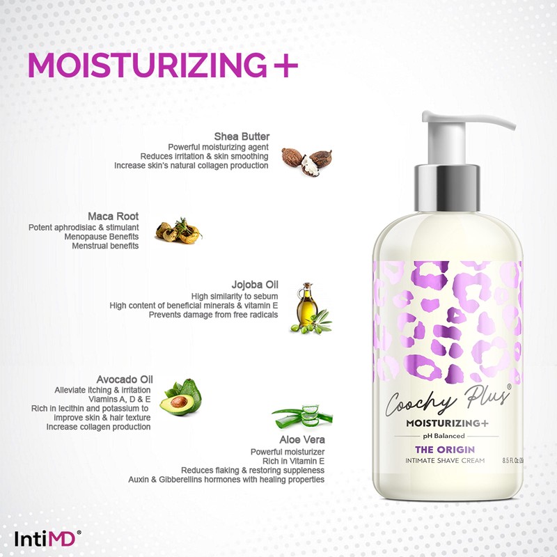 • COOCHY PLUS Intimate Shave Cream is formulated with 5 powerful moisturizing, and vitamins-rich agents that dramatically improves your intimate shaving experience; Jojoba Oil / Avocado Oil / Aloe Vera / Shea Butter / Maca Root. It’s formulated for the most intimate areas of the body, for safely used on any other parts of the body. Helps soften the most coarse body hair, such as pubic hair or underarm hair. MOISTURIZING+ agents form an invisible shield on your skin to deliver a closer shave.