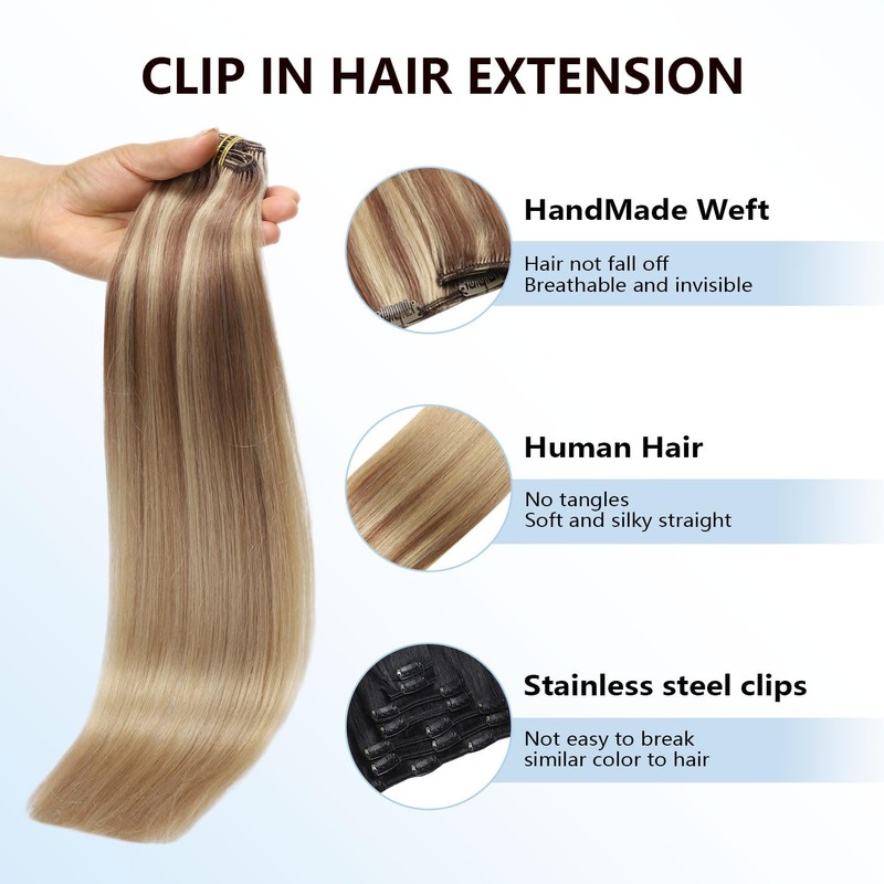 COOKAYU Clip in Hair Extensions Real Human Hair, 10/16/16 Gold Brown to Caramel Blonde Ombre Hair Extensions Clip in Human Hair, 18inch 120g 7Pcs