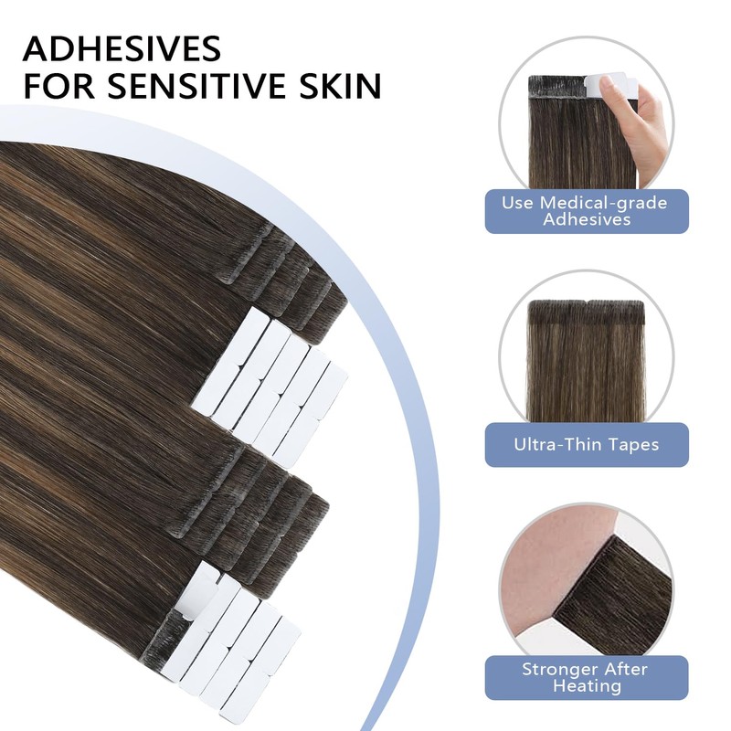- Premium Quality Tape Ins: tape in hair extensions are made of high-strength invisible tape. Hypoallergenic, docile and waterproof. Double-sided tape will be stronger after moderate heating.