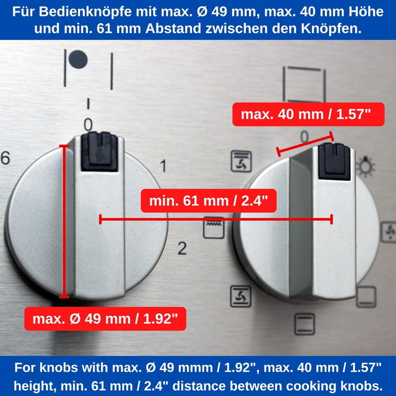 - For stove knobs with max. Diameter 49 mm and 40 mm height: To ensure that the stove knob fits child lock, hob controls must have a max. Height of 4 cm, a max. Diameter of 4.9 cm and a centre-to-centre distance of min. 6.1 cm.