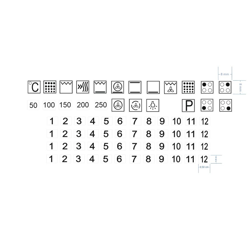 - 1 set of stove stickers with 71 symbol stickers either black background with white signs or white background with black characters