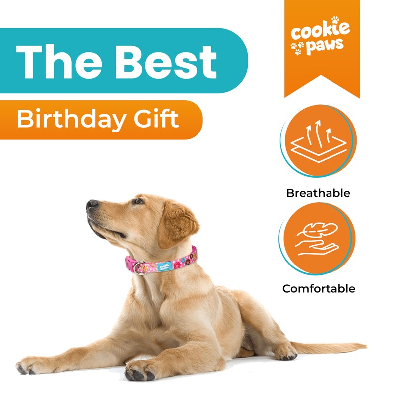 - VIBRANT DESIGNS: Let your dog's personality shine with our unique and vibrant collar patterns. Cookie Paws offers 10 eye-catching designs to choose from, each precisely stitched with colorfast material that remains vivid and vibrant, even in challenging weather conditions. The collars are also waterproof, stain-resistant, and UV/fade-resistant, making them perfect for showcasing your pup's style rain or shine.