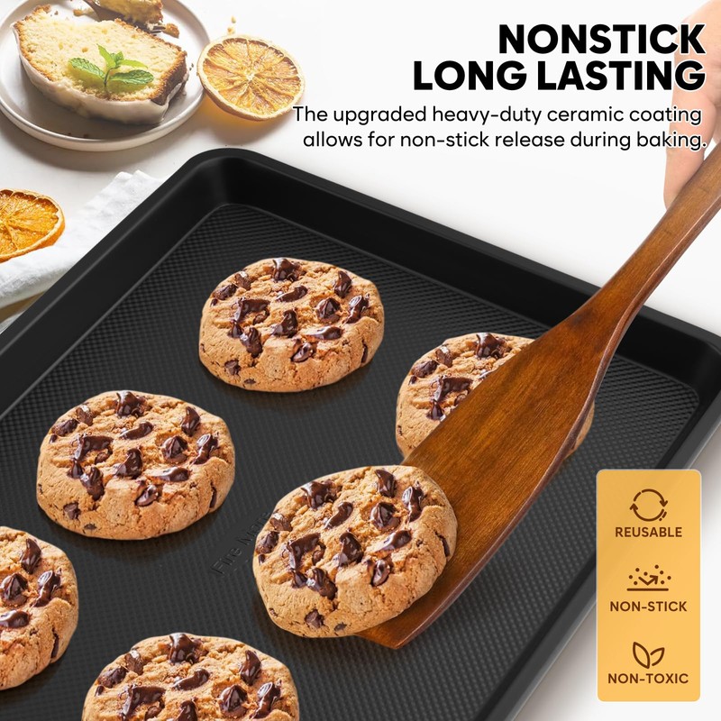 • Excellent Non-Stick Coating: Our cookie sheet features high-quality Whitford non-stick coating and reinforced double protective layers to ensure perfect food release. Eco-friendly ceramic coating (PFOA-free) releases cookies and roasts effortlessly. No sticky mess, no toxic fumes. Just wipe clean – zero scrubbing battles