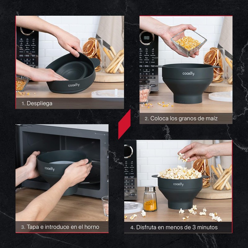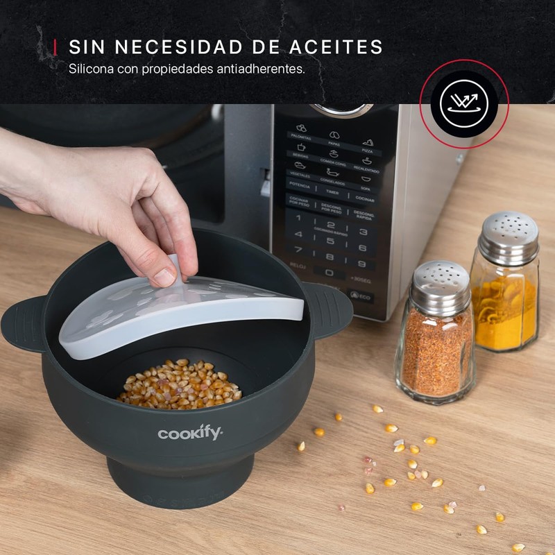 - PREPARACIÓN SALUDABLE EN EL MICROONDAS: Disfruta de palomitas de maíz rápidas y sin complicaciones con la palomera Cookify. Ideal para usar en horno de microondas, su amplio recipiente con tapa facilita condimentarlas al gusto. Listas en minutos.
