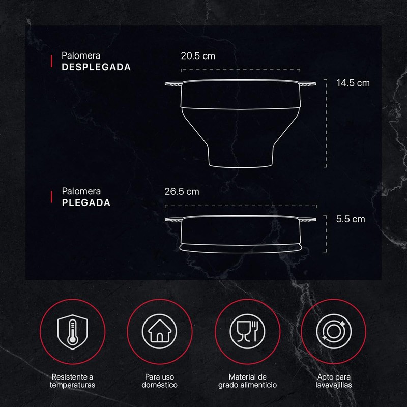 - MEDIDAS: Cuerpo: Diámetro (sin asas: 20.5 cm, con asas: 26.5 cm) x Alto (plegado: 5.5 cm, desplegado: 14.5 cm), Asas: Largo: 6 cm x Ancho: 3 cm