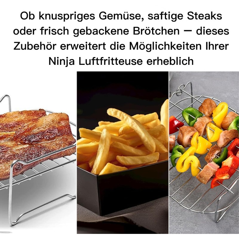 Cooking Rack and Stainless Steel Rack with Skewers Hot Air Fryer Accessories - Air Fryer Stand Compatible with Ninja Foodi AF300EU, AF400EU, AF500EU & Other Dual Zone Air Fryer (7.6L - 9.5L)