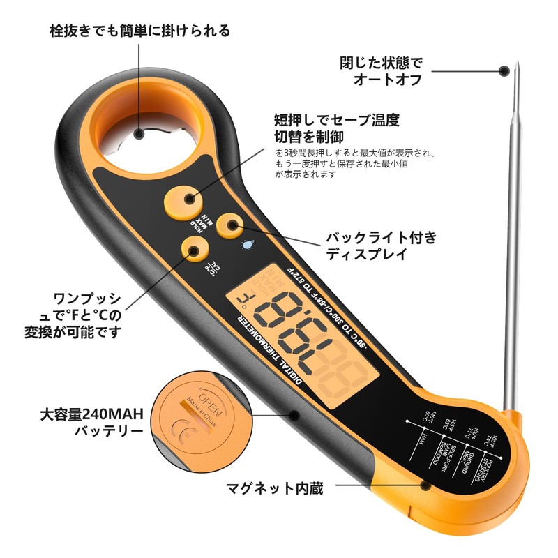 • 【Auto Off and Washable】This digital food thermometer can be folded for convenient storage. Auto power off when not in use for about 10 minutes. IPX7 waterproof and can be washed under running water (do not soak in liquid or use in dishwasher)