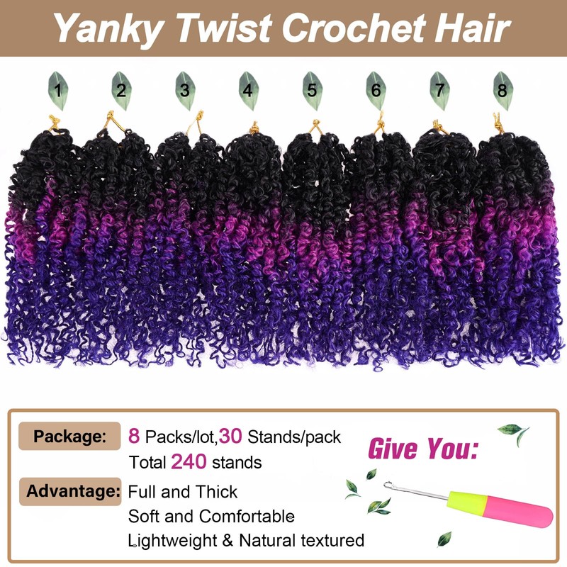 - 【8 Inch Pre-twisted Yanky Twist Crochet Hair】 Get ready to show off your charm with our beautiful Yanky Twists Braiding Hair Curly Ends! Our new style Bohemian Yanky Twists Crochet Braids is Pre-Twisted, with very natural little curls at the ends, very cute. 8 packs/lot, 30 strands/pack, total 240 strands,usually 7-10 packs can full one head.There are many colors to choose from to match your style!