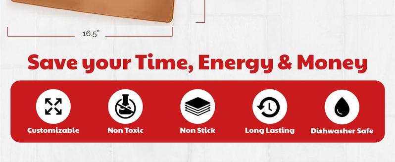 FEATURES & BENEFITS - Size: 16.5" x 23" - Easy Clean Up - Dishwasher Safe - BPA and PFOA free - Resizable (Cut to Fit) - Reusable & Reversible - Catch Drips, Spills & Splatters - No More Scrubbing Oven Floors - No Need for Toxic Household Oven Cleaners - 100% Non-Stick. Can also be used on the grill.