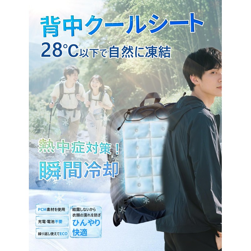For heatstroke prevention. Cooling Continuously: Uses PCM material that freezes below 86°F (28°C) and cools your back for a long time. Reduces stuffiness in backpacks and strollers and is ideal for preventing heat stroke in summer.