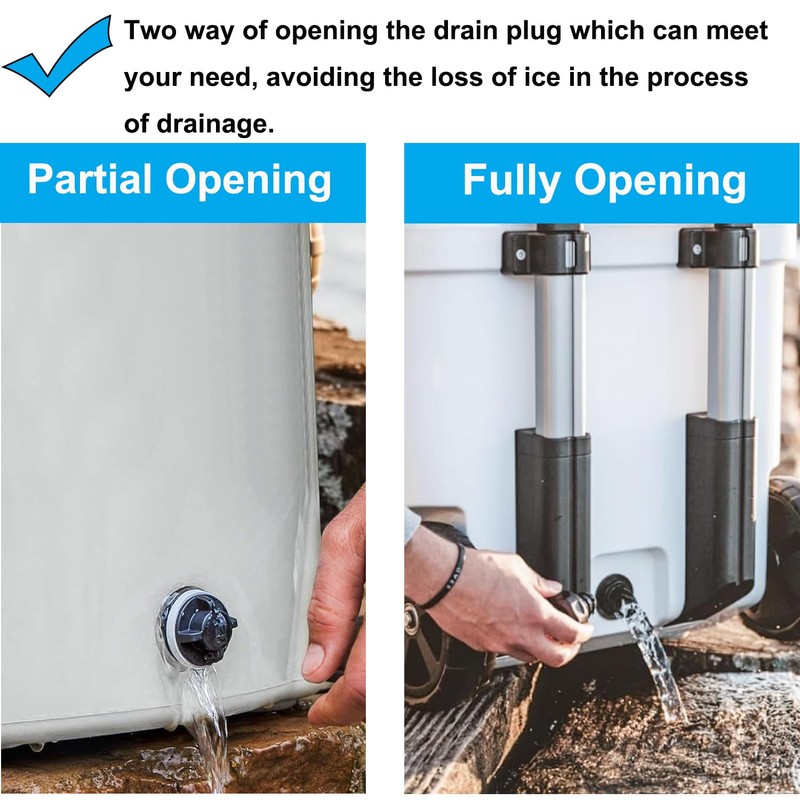 - 【Easy to Use】These Replacement Drain Plugs Can Drain The Cooler Water While Drain Plug Is Partially Open. Simply Unscrew The Drain Plug, Pull It Out, Tilt Your Cooler, And Let The Water Out. Tighten The Cooler Drain Plug Is Good For Keeping Your Coolers Cold