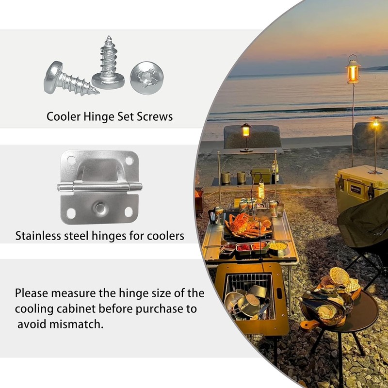 Cooler Hinges : Size 2" x 2.125". Include:4 hinges and 16 screws.