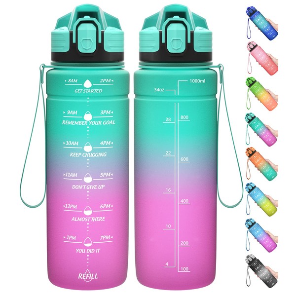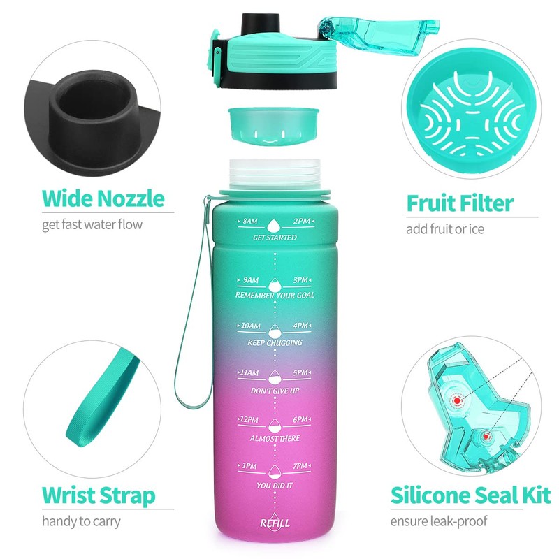 - Water bottle with time marker: the motivational water bottle features a unique inspirational quote and time marker that allows you to track your daily water intake. The wide mouth with filter allows you to add ice and fruit to prepare DIY drinks.