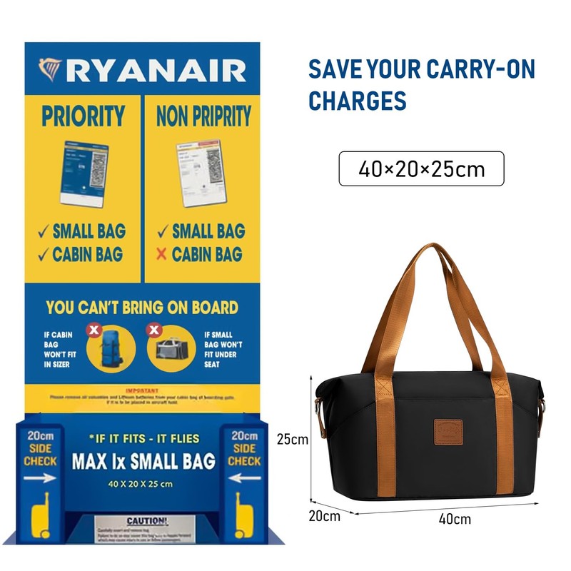 - SAVE YOUR EXTRA CHARGES: Bag size 40×20×25cm fits small underseat cabin bag size 40x20x25cm of Ryanair Airlines perfectly, which can be placed under seat and no need to pay for extra baggage.