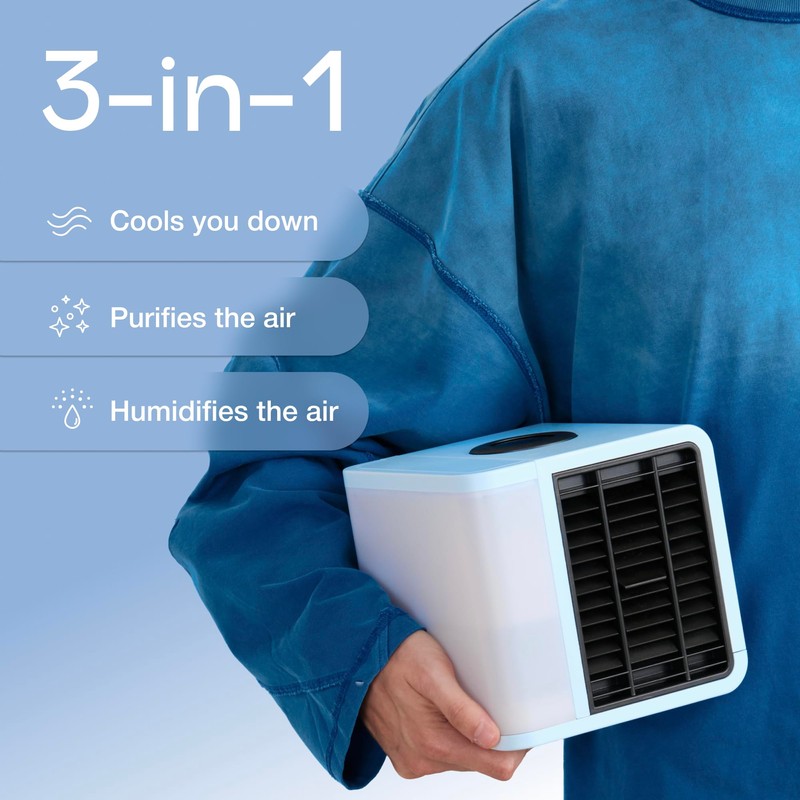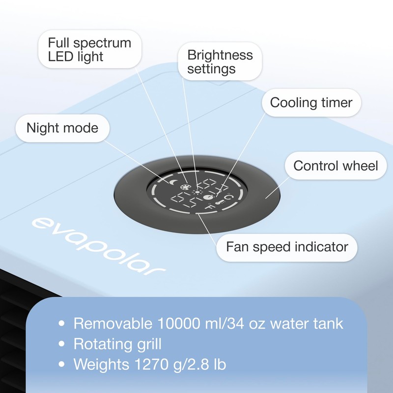- Cooling 3in1 – Evapolar evaLIGHT Plus cools & humidifies the air using evaporative technology. evaLIGHT Plus mini air conditioner is equipped with a display, a removable water tank (34 oz capacity), sleep timer, and a luxury LED lighting. But it is designed to cool your body, not a room