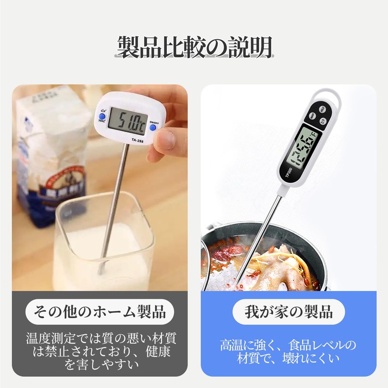 - Quick Temperature Measure: The cooking thermometer measures very fast, and it will display the temperature in just seconds when you attach the temperature to your food like oil or hot water, saving you time and effort. The long probe is safe during measuring and eliminates the worry of burning your hands