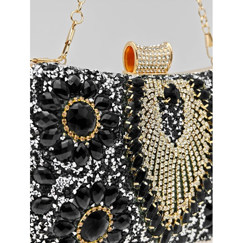 - This evening bag is a stunning accessory that combines elegance with a touch of glamour. Adorned with sparkling rhinestones, it offers a dazzling display that catches the eye at any formal event.