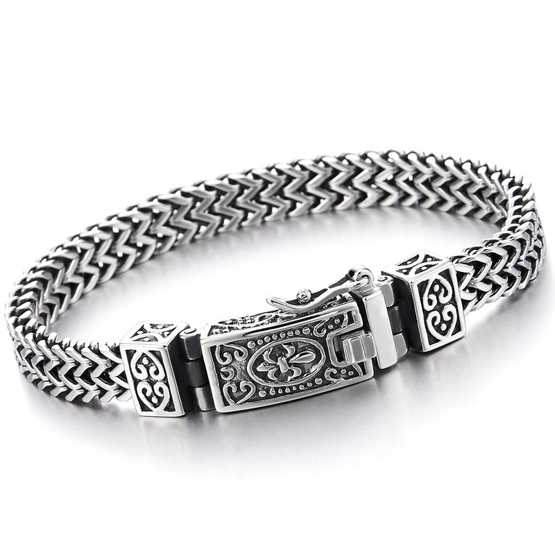 COOLSTEELANDBEYOND Biker Men's Franco Link Curb Chain Bracelet Stainless Steel with Vintage Fleur de Lis Spring Ring Clasp, Stainless steel metal, Non-applicable