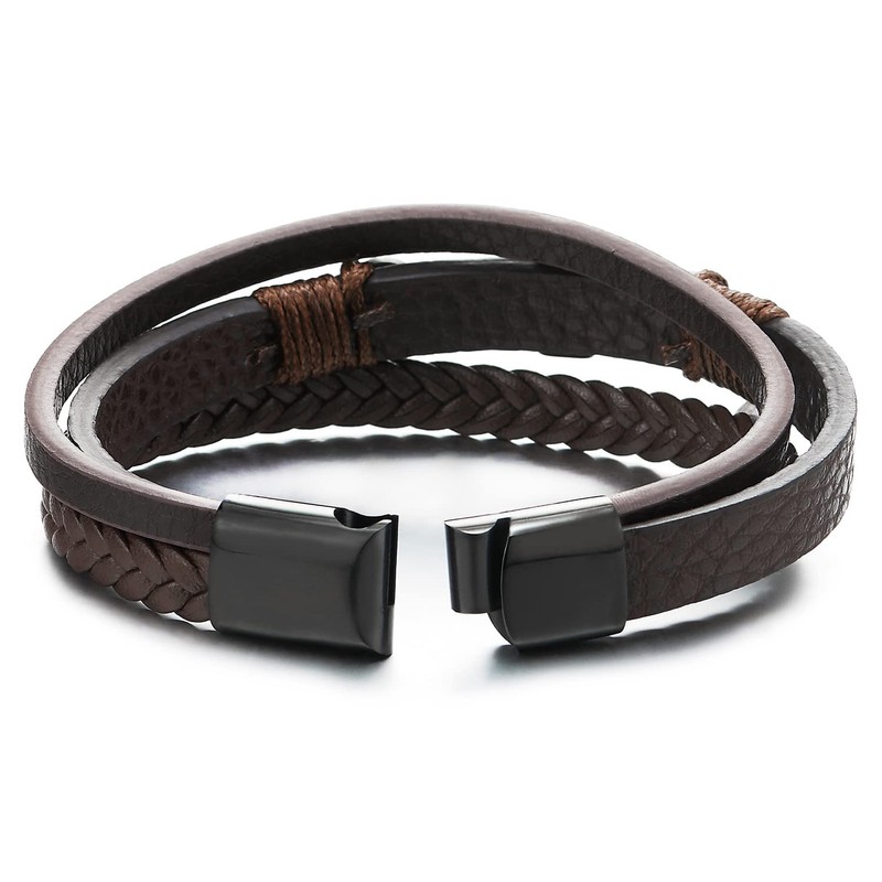 - Black Steel Horizontal Sideway Lateral Flat Cross Three-Strand Brown Braided Leather Bangle Bracelet