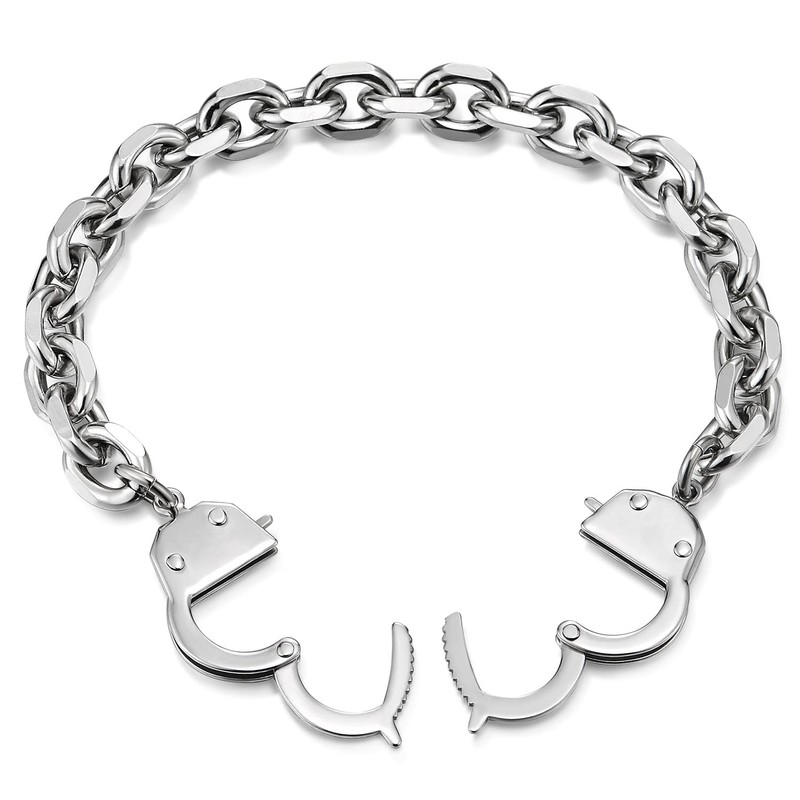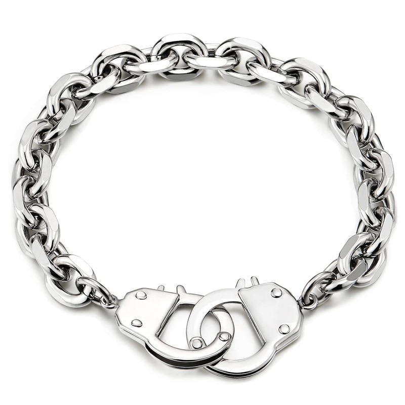 COOLSTEELANDBEYOND Exquisite Stainless Steel Men's Women's Handcuffs Link Chain Bracelet Bangle Polished Silver Colour, Stainless Steel, No gemstone